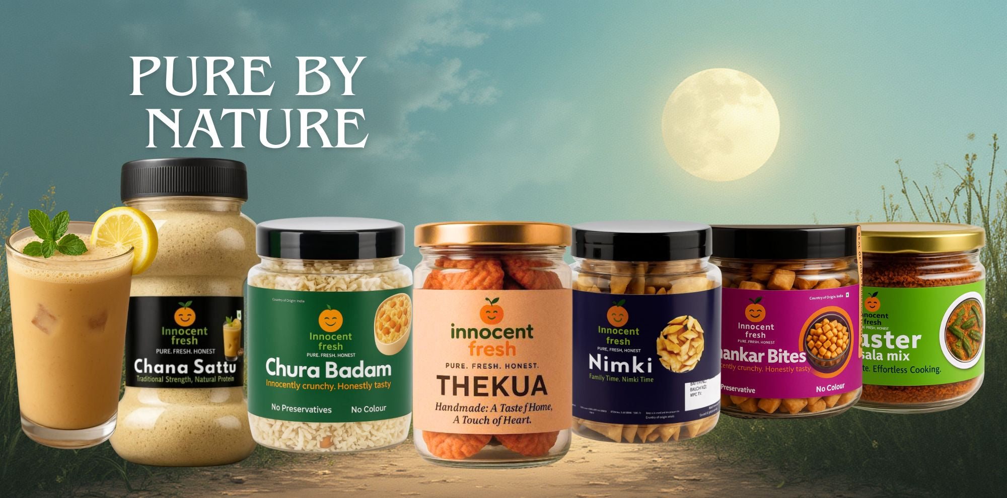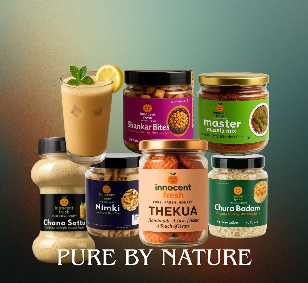Innocent Fresh brings pure, tasty and healthy traditional Indian snacks inspired by village kitchens and childhood memories. Enjoy authentic foods like thekua, nimki and sattu, made with carefully selected ingredients, hygienic processes and timeless recipes for everyday goodness.